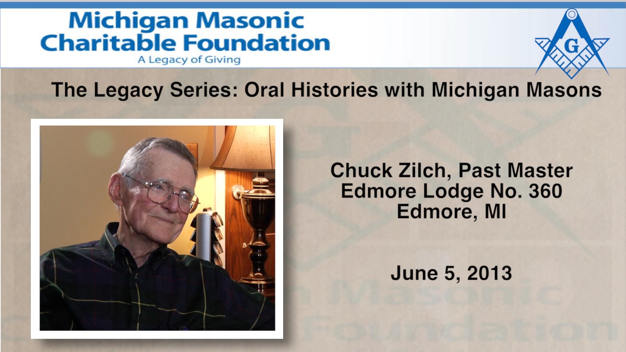 The Legacy Series: Oral Histories with Masons of Michigan. In this segment, Keith Bankwitz, Dir. of Philanthropy for the Michigan Masonic Charitable Foundation, interviews Chuck Zilch, Past Master of Edmore Lodge No. 360. The interview was conducted at Pathways the Masonic Retirement Community in Alma, MI. The date was June 5, 2013.